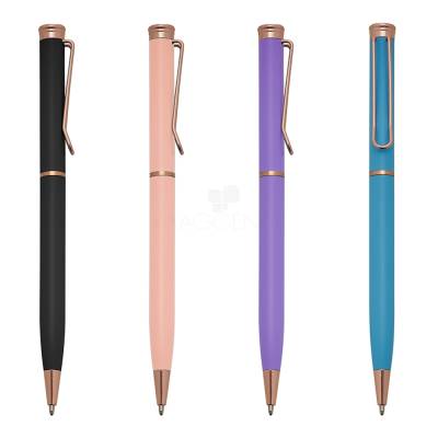Caneta de metal personalizada com detalhes em metal dourado rosê, possui acionamento por giro, clip curvado de metal e esferográfica na cor azul. Ideal para brindes promocionais e eventos corporativos.