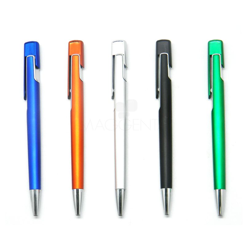 Brinde Caneta de plástico com click injetada com corpo colorido e clip colorido. Consultar as cores