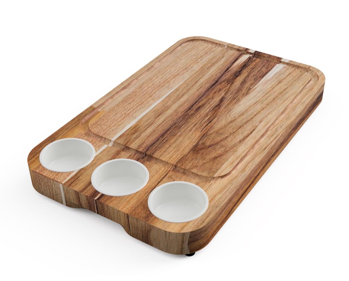 Tábua de Corte Personalizada produzido em madeira Teca de alta resistência. Possui 3 ramekins de porcelana para molhos e acompanhamentos. Design moderno e elegante perfeito para trabalhos culinários de alto padrão. Ideal para brindes em campanhas promocionais, eventos corporativos e feiras gastronômicas.