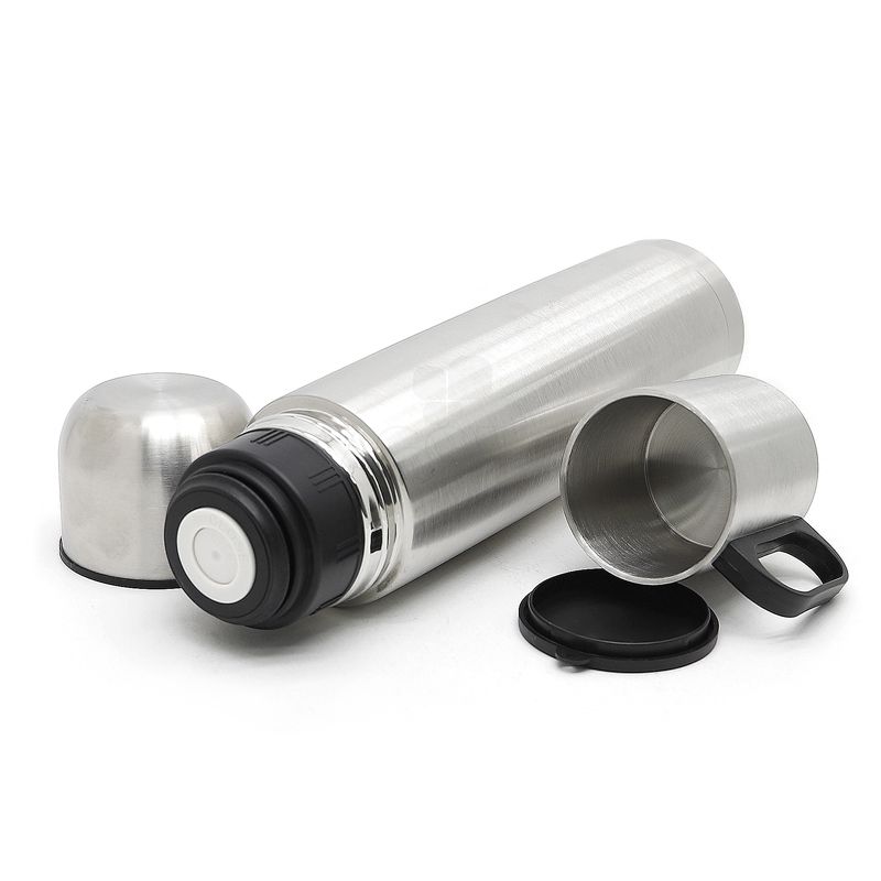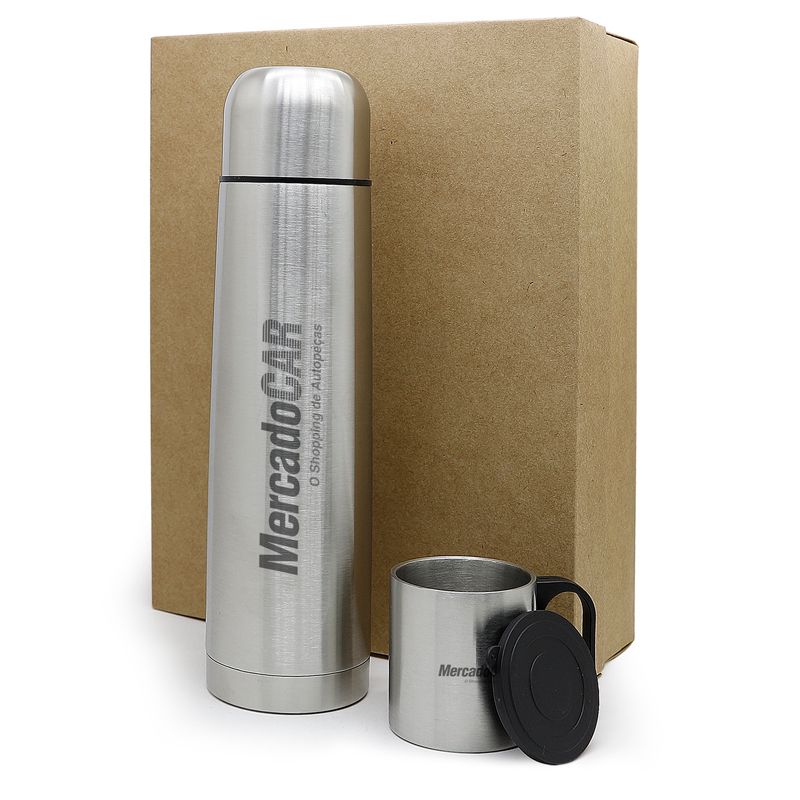 Kit personalizado com garrafa térmica e caneca em metal Inox com acabamento aço escovado. Acompanha 1 garrafa térmica 1L e 1 canecas com capacidade para 180ML acondicionados em uma embalagem de papel kraft 400gr. Ideal para brindes promocionais e eventos corporativos.