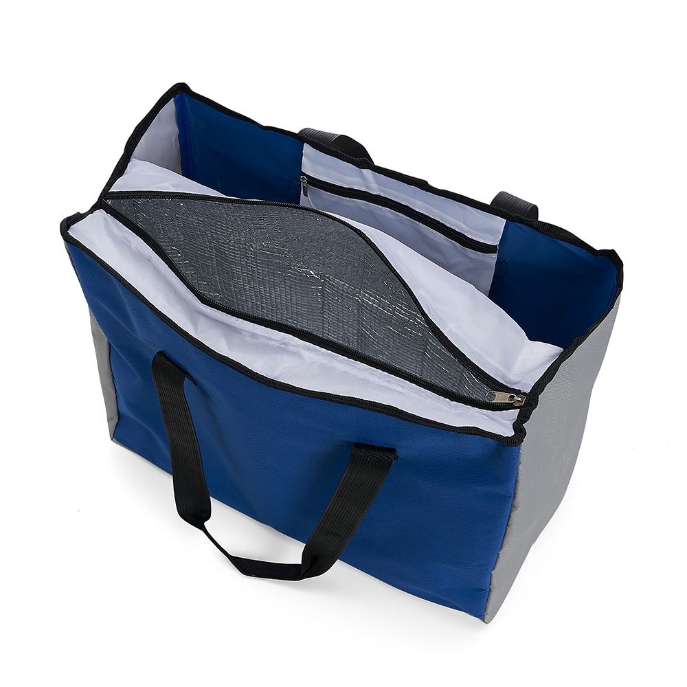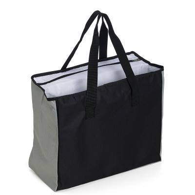 Sacola em poliéster personalizada com capacidade para 25 litros. Possui alças laterais, 1 pequeno bolso interno e dois compartimentos principais, sendo um deles térmico e ambos com fechamento por zíper. Ideal para brindes promocionais e eventos corporativos. Imagem ilustrativa.