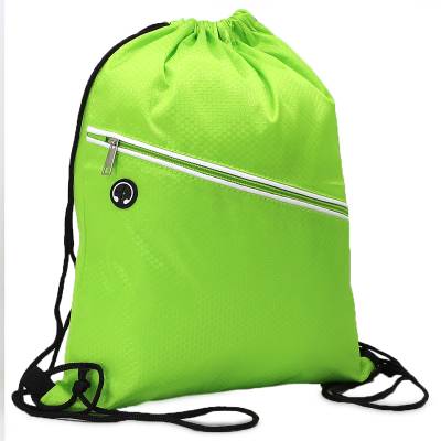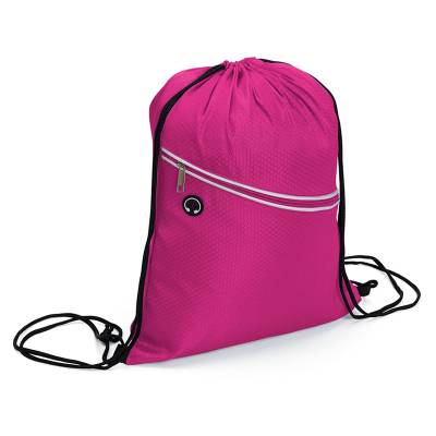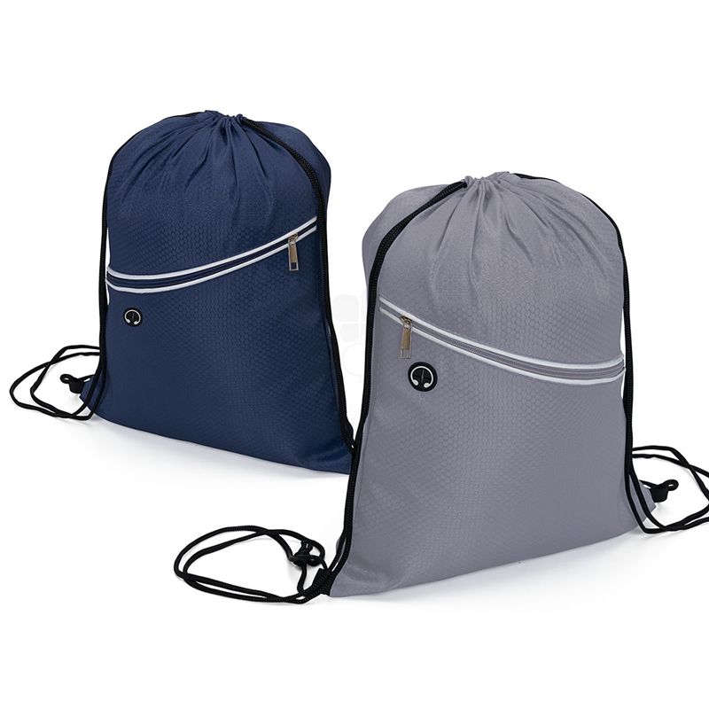 Mochila saco personalizada produzida em fibra de poliéster resistente à água. Contém bolso diagonal na parte frontal com entrada para fones de ouvido e alças de nylon. Ideal para brindes promocionais e eventos corporativos. Obs: Fone de ouvido não acompanha o produto.