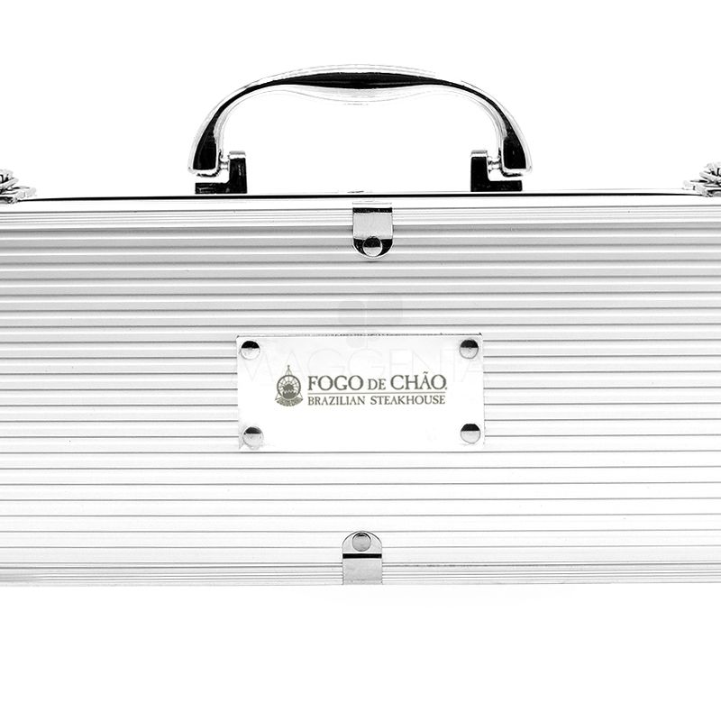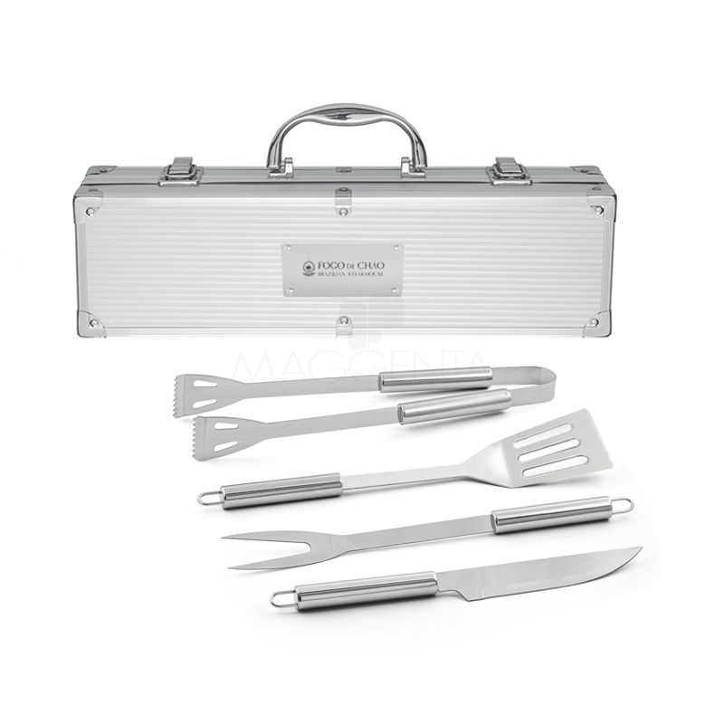 Kit churrasco 4 peças em maleta de alumínio com travas de segurança. Possui 1 espátula, 1 pegador, 1 garfo e 1 faca em inox. Parte interna da maleta com revestimento em Tnt e suportes de velcro para fixação das peças.