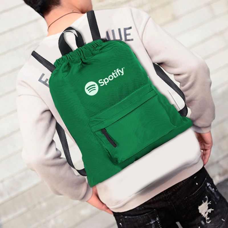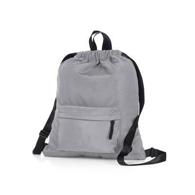 Mochila saco personalizada produzida em poliéster com detalhes em nylon. Contém bolso de zíper na parte frontal, alça de mão e alças de nylon para as costas. Tecido resistente à água e parte traseira em material antitranspirante. Ideal para brindes promocionais e eventos corporativos.