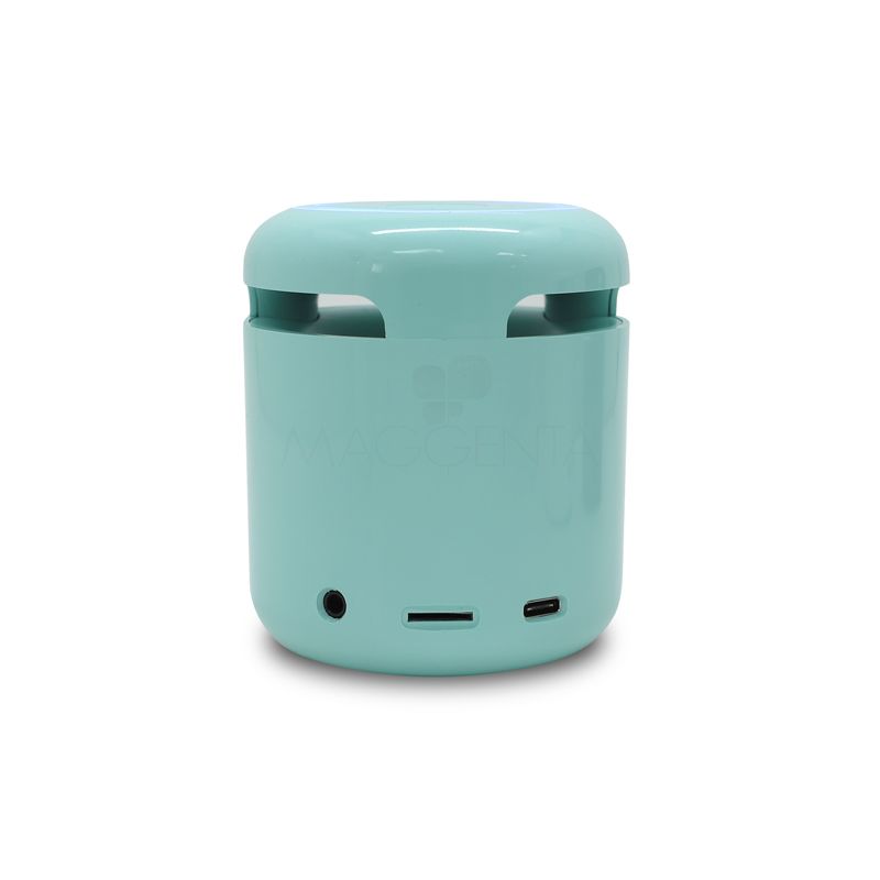 Caixa de som bluetooth com relógio despertador, produzida em plástico e com borrachas antiderrapantes na área inferior, a caixa de som tem bateria de longa duração, display de LED na área frontal, e anel de led brilhante na parte superior. A caixa de som executa nos modos bluetooth, rádio FM, cartão TF-microSD e entrada auxiliar P2. Acompanha cabo USB e manual em inglês e chinês. Imagem ilustrativa.