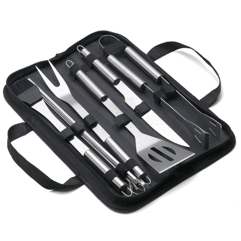 Kit Churrasco 9 Peças em estojo de nylon com alça. Contém: pegador, garfo, espátula, faca, pincel e 4 espetos. Utensílios de inox com proteções plásticas e parte interna com velcro para fixação das peças, acompanha plaquinha metálica para personalização. Ideal para brindes promocionais e eventos corporativos.