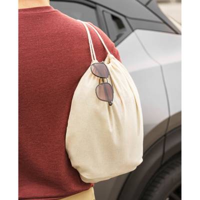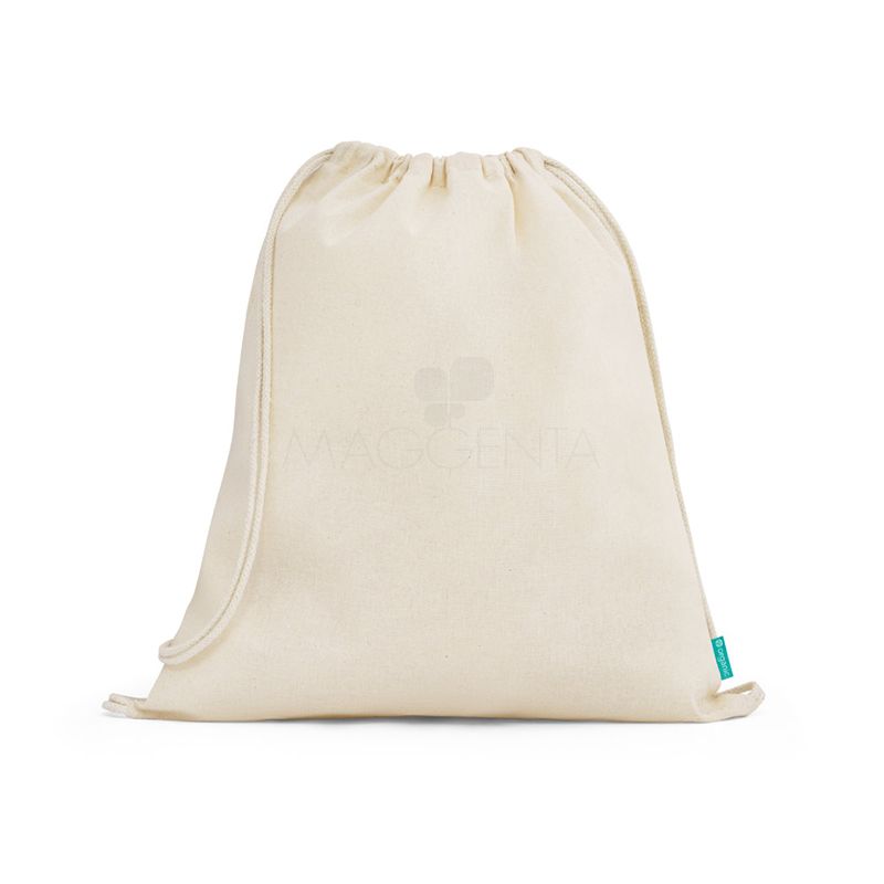 Mochila saco ecológica personalizada produzida em 100% algodão orgânico (120 g/m²) proveniente de um cultivo sustentável sem químicos ou pesticidas. Possui amplo espaço, alças de 60 cm e etiqueta Label Organic lateral. Ideal para brindes promocionais e eventos corporativos. Imagem ilustrativa.