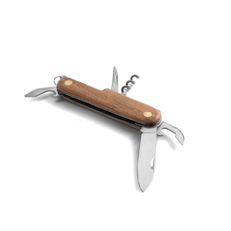 Canivete 5 funções personalizado produzido em aço inox e detalhe em madeira. Ideal para brindes promocionais e eventos corporativos.