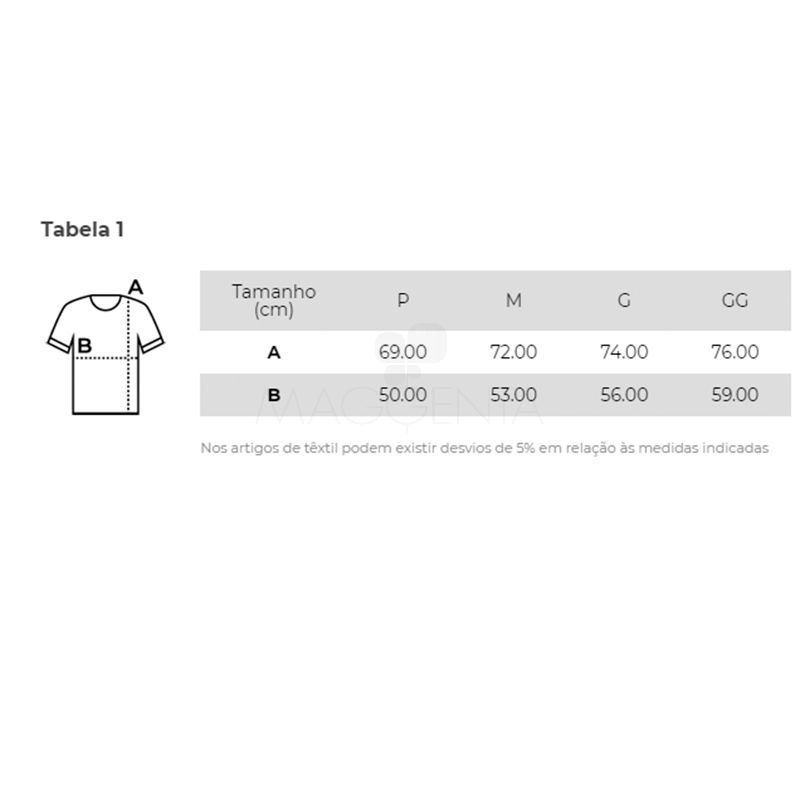 Camiseta unissex de corte regular produzida em malha jersey 100% algodão (150 g/m²) com costura dupla nas mangas e parte inferior. Tamanhos: P (A69 x B50cm), M (A72 x B53cm), G (74 x 56cm), GG (A76 x B59cm). Personalização em transfer. Obs: Nos artigos de têxtil podem existir desvios de 5% em relação às medidas indicadas.