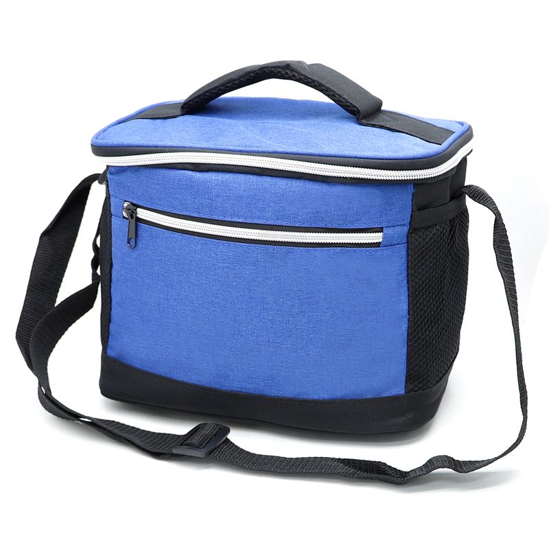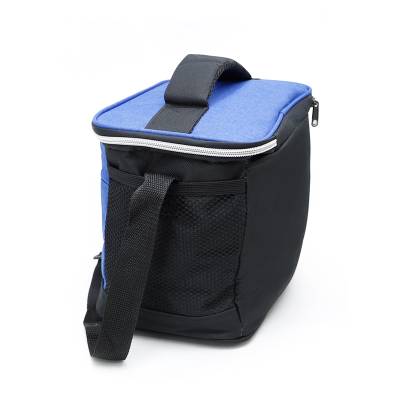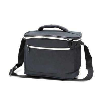 Bolsa térmica personalizada com capacidade para 10 litros. Possui bolso frontal e principal com zíper, bolsos laterais em tela em nylon, cursores de metal, alça transversal regulável para ombro, alça de mão almofadada e compartimento interno com revestimento térmico. Ideal para brindes promocionais e eventos corporativos. Imagem ilustrativa.