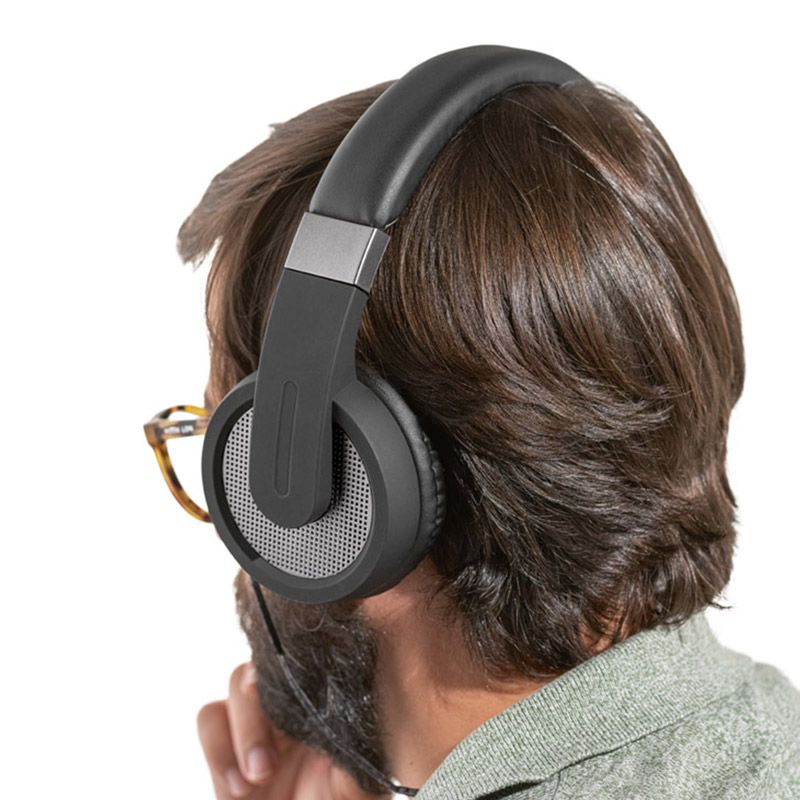 Fones de ouvido em ABS e PU com microfone, transmissão por bluetooth 5.0 e potência de 30 mW. A bateria tem uma capacidade de 300 mAh e tempo de reprodução de 12 horas. Incluso cabo de carregamento micro USB. Imagem ilustrativa.