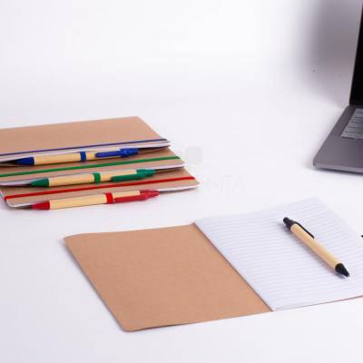 Bloco de anotações personalizado produzido em capa de papel kraft com elástico para fechamento da capa. Possui suporte lateral para caneta, miolo com 30 folhas pautadas e 1 caneta esferográfica com corpo em papel reciclado e clip plástico. Imagem ilustrativa.