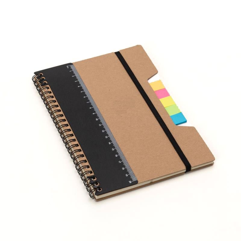 Bloco de anotações personalizado produzido com capa em papel kraft. Possui régua destacável de 20cm, Miolo de 70 folhas pautadas bege, 5 Sticky notes coloridos de 25 folhas,1 Bloco de anotações 7,5cm x 7,5cm com 25 folhas, elástico de fechamento e wireo de metal. Imagens ilustrativas.