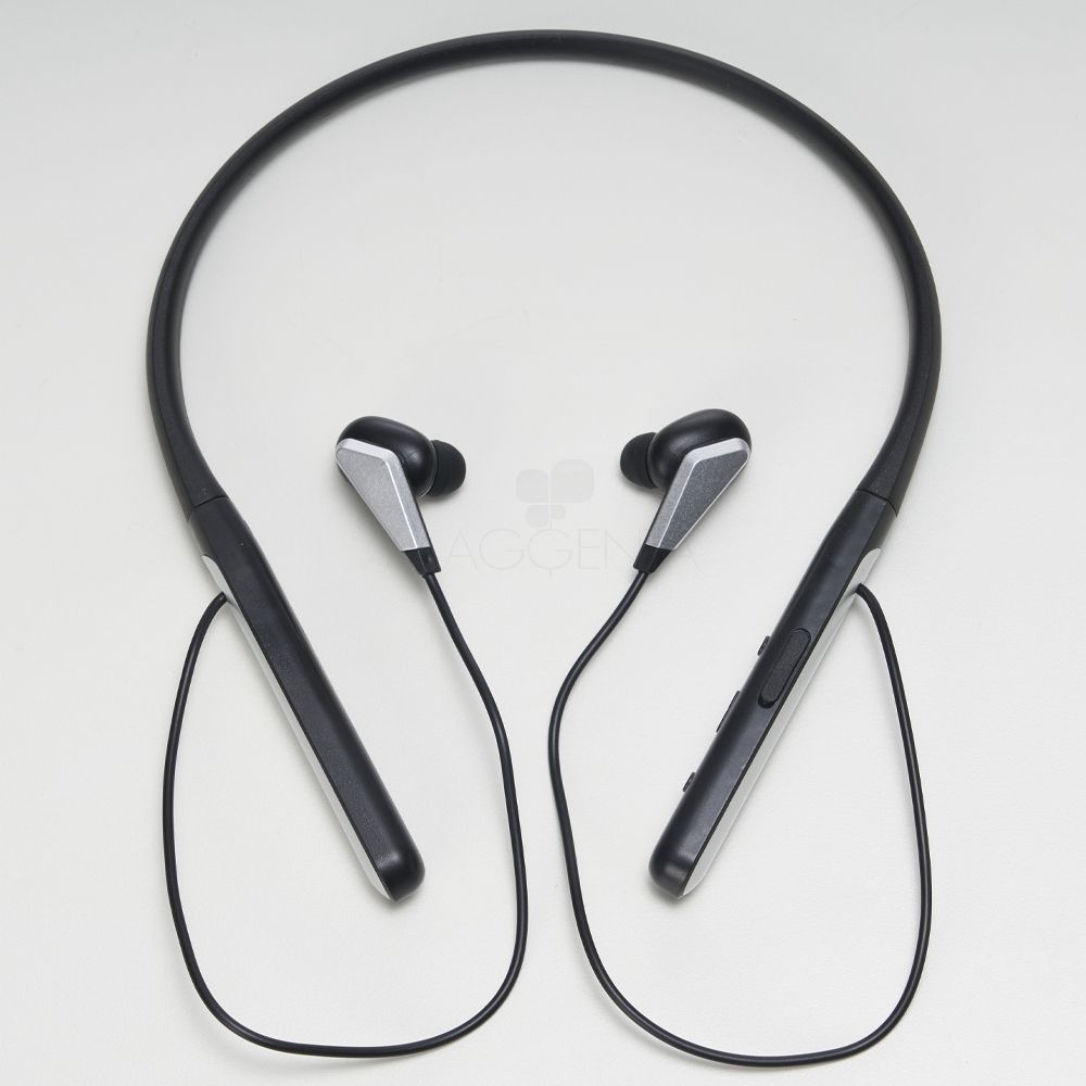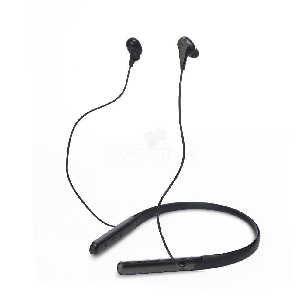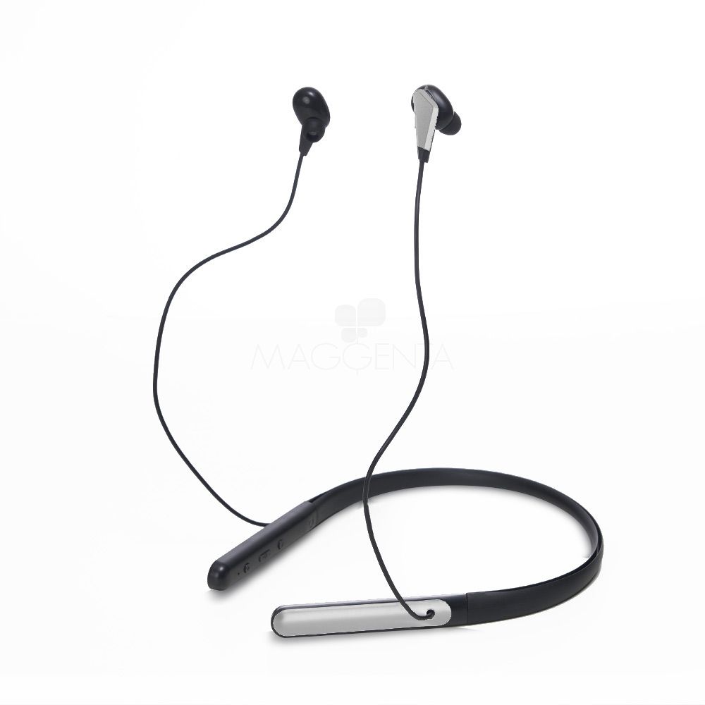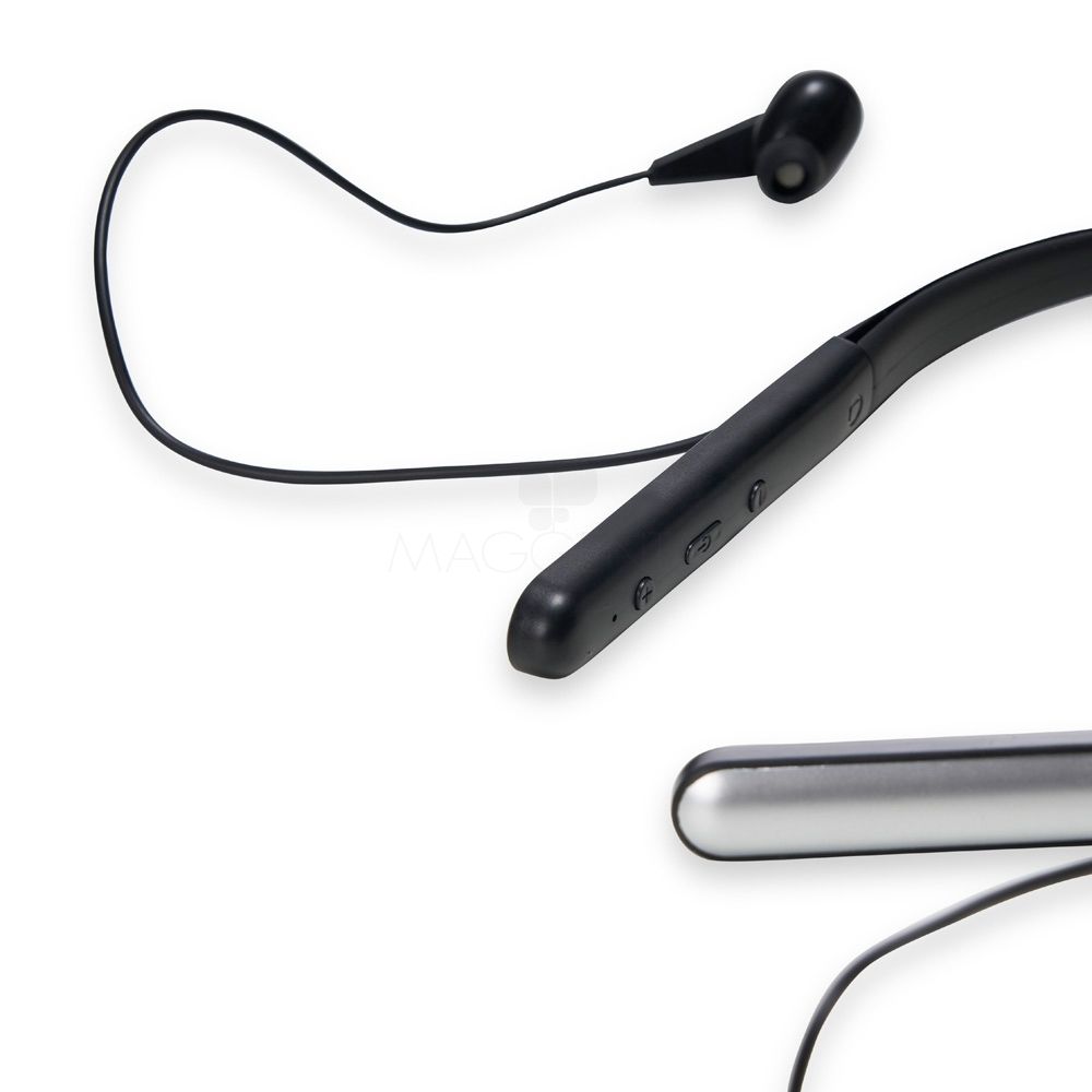 Fone de ouvido bluetooth com haste para pescoço. Possui microfone para atendimento de chamadas telefônicas, botões liga/desliga, função volume + –, e haste com entrada para carregamento micro USB, acompanha USB paca carregamento. Ideal para brindes promocionais e eventos corporativos. Imagem ilustrativa.