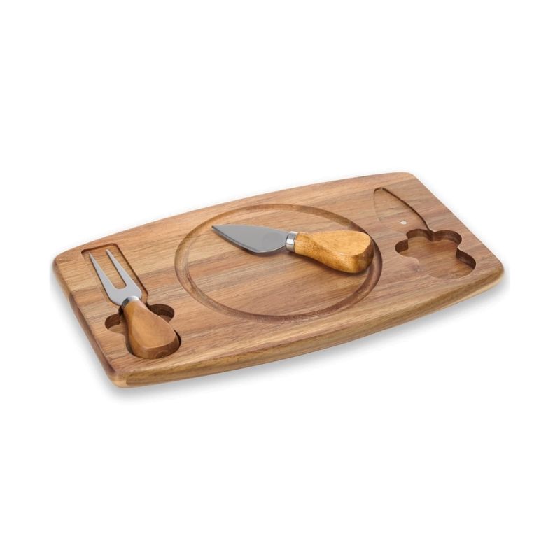 Kit queijo 3 peças, contém: tábua de madeira com canaleta, faca com ponta, e garfo. Tábua com imã para encaixe e fixação dos utensílios. Ideal para brindes promocionais e eventos corporativos. Imagem ilustrativa.