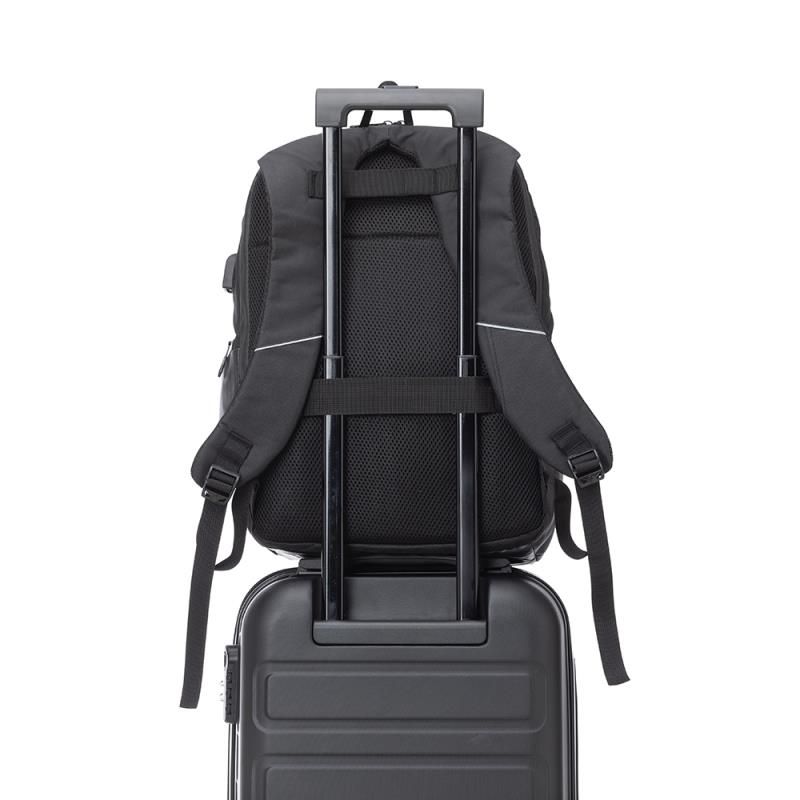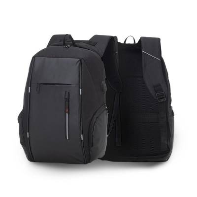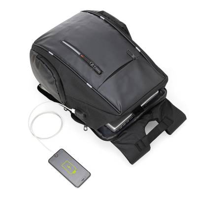 Mochila para Notebook personalizada produzida em tecido poliéster. Parte externa possui, 2 Bolsos frontais com ziper; 2 Bolsos laterais; Alça de mão e ombro acolchoadas e conector USB na lateral. Parte interna: Compartimento para notebook de até 17 polegadas. Ideal para brindes promocionais e eventos corporativos. Imagem ilustrativa. Obs: Compatível com tamanho de notebook máximo de 40 x 28 Cm.