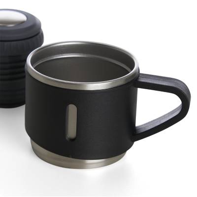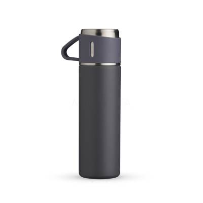 Garrafa térmica personalizada produzida em inox com capacidade para 450ml, possui tampa removível que pode ser utilizada como caneca, tampa interna em plástico resistente (basta um clique para abrir ou fechar) e base com borracha antiderrapante. Ideal para brindes promocionais e eventos corporativos.