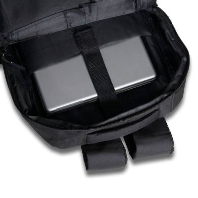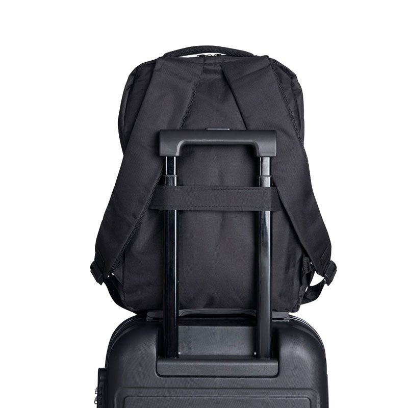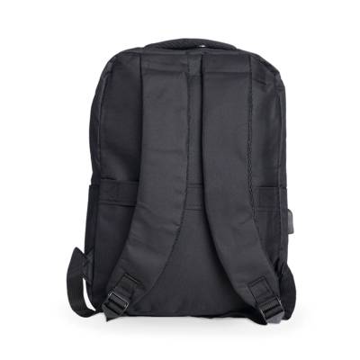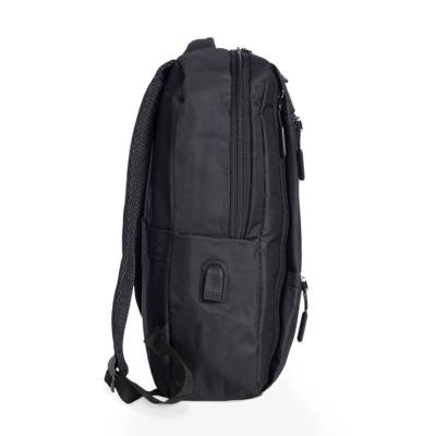 Mochila confeccionada em nylon com compartimento para notebook até 15,6 polegadas. Contém compartimento grande com divisórias para documentos, eletrônicos e caneta, dois compartimentos frontais com abertura horizontal, bolso lateral e adaptador USB externo com cabo acoplado, permitindo a conexão de um carregador portátil de dentro da mochila e transferência da carga para o lado externo, ocultando o carregador e viabilizando a utilização do celular durante o processo. Contém zíperes com pegadores plásticos, alça de mão em nylon, alças para as costas ajustáveis com revestimento espumado antitranspirante e alça horizontal para encaixe em malas de viagem. Ideal para brindes promocionais e eventos corporativos. Imagem ilustrativa.