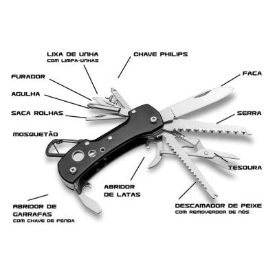 Canivete personalizado produzido em aço inox com 12 funções e mosquetão lateral. Faca serra, descamador de peixe com removedor de nós, tesoura, abridor de latas, abridor de garrafas com chave de fenda, mosquetão, chave Philips, furador, lixa de unha com limpador de unhas, agulha e saca rolhas. Quando for viajar, para se ter no seu carro, na sua caixa de ferramentas, para pesca, camping; esse canivete completo irá lhe tirar de qualquer? Perrengue?. é também o presente certo para se agradar alguém querido, pois não haverá erro!