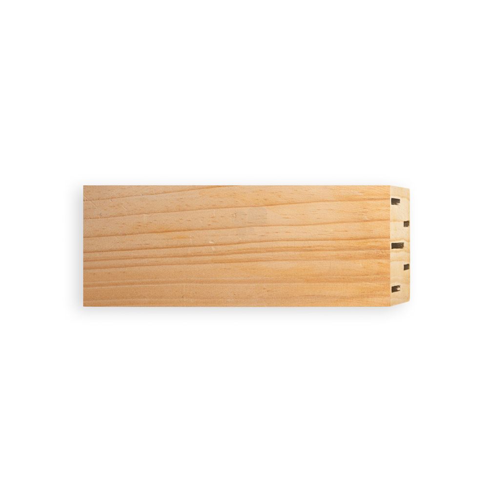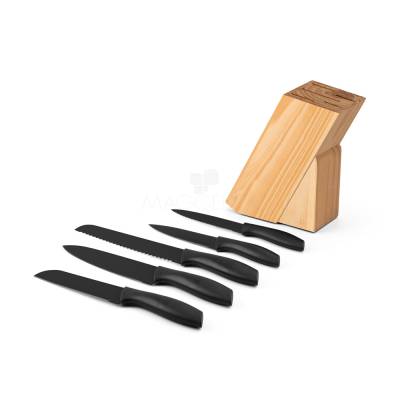 Suporte para facas em madeira de pinho personalizado. Incluso conjunto de 5 facas de cozinha: faca utilitária média, faca utilitária pequena, faca para vegetais, faca para pão e faca para carne. Peças em aço inox e PP, cabo com acabamento emborrachado. Próprio para cortes de alimento em geral. Ideal para brindes promocionais e eventos corporativos.