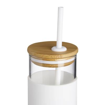 Copo de vidro com capa protetora de silicone, tampa de Bambu e canudo de silicone. Capacidade de 450ml.