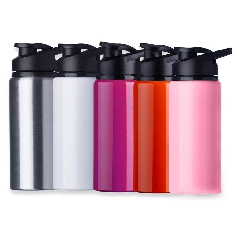 Squeeze alumínio de 600ml com pintura brilhante. Squeeze com tampa plástica rosqueável, alça e tampa protetora para o bocal.