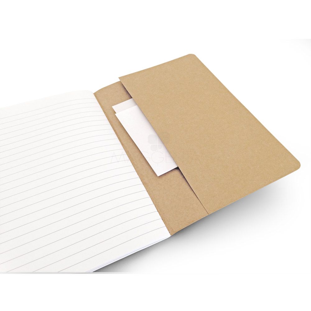Caderno A5 com 40 folhas pautadas de papel reciclado e capa em cartão com bolso interior.