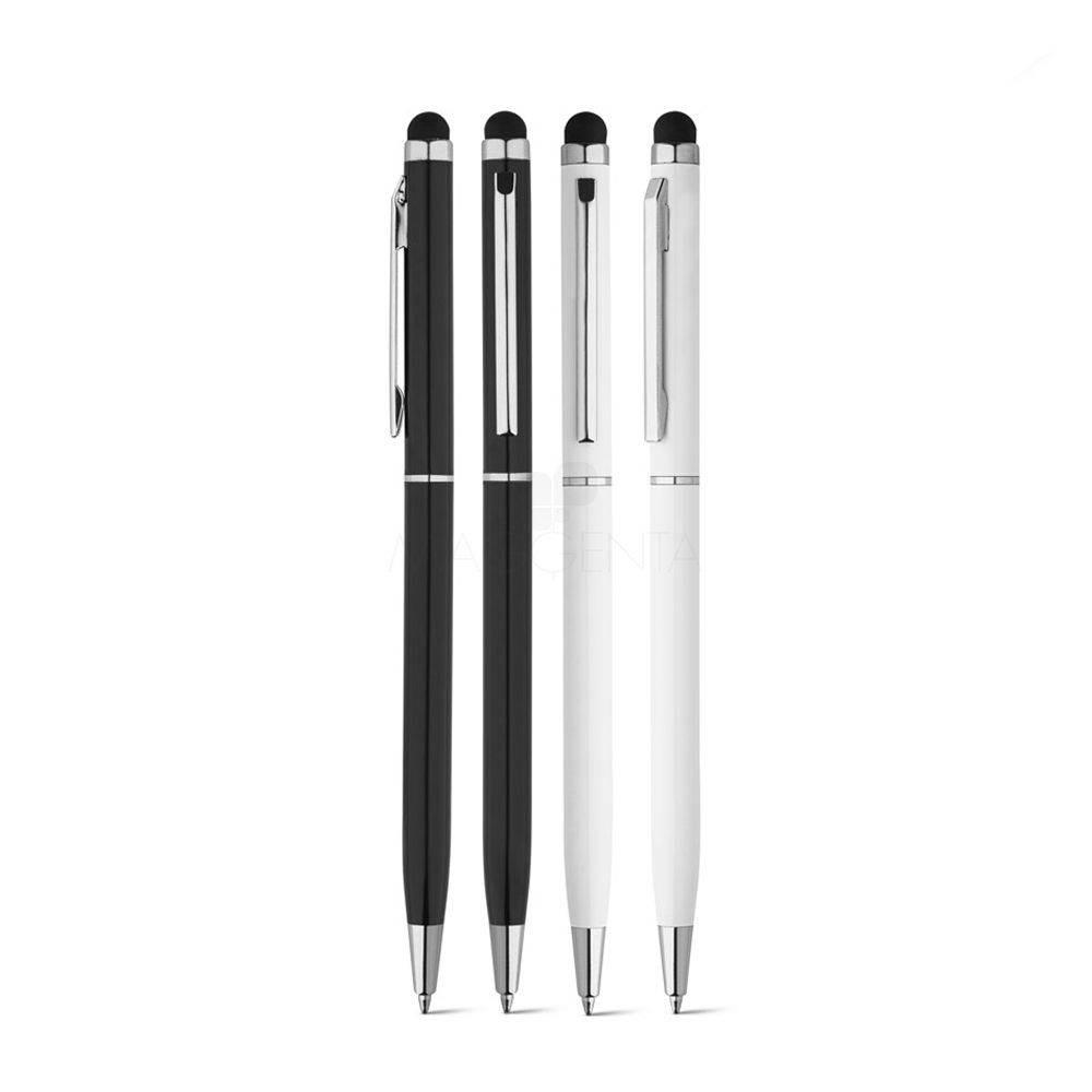 Esferográfica em alumínio com tratamento antibacteriano, . Mecanismo twist, clipe e ponteira touch.