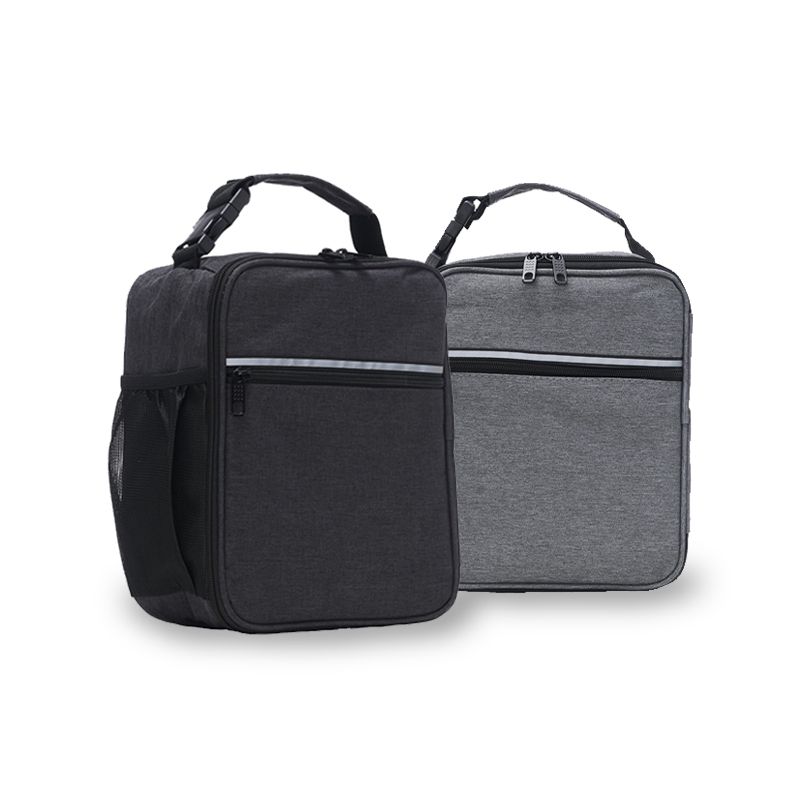 Bolsa térmica de nylon personalizada com dois compartimentos e capacidade de 6 litros. Com bolso telado e tela média de proteção interna, a bolsa possui uma faixa frontal refletiva, bolso lateral telado e alça de mão com fivela de encaixe.