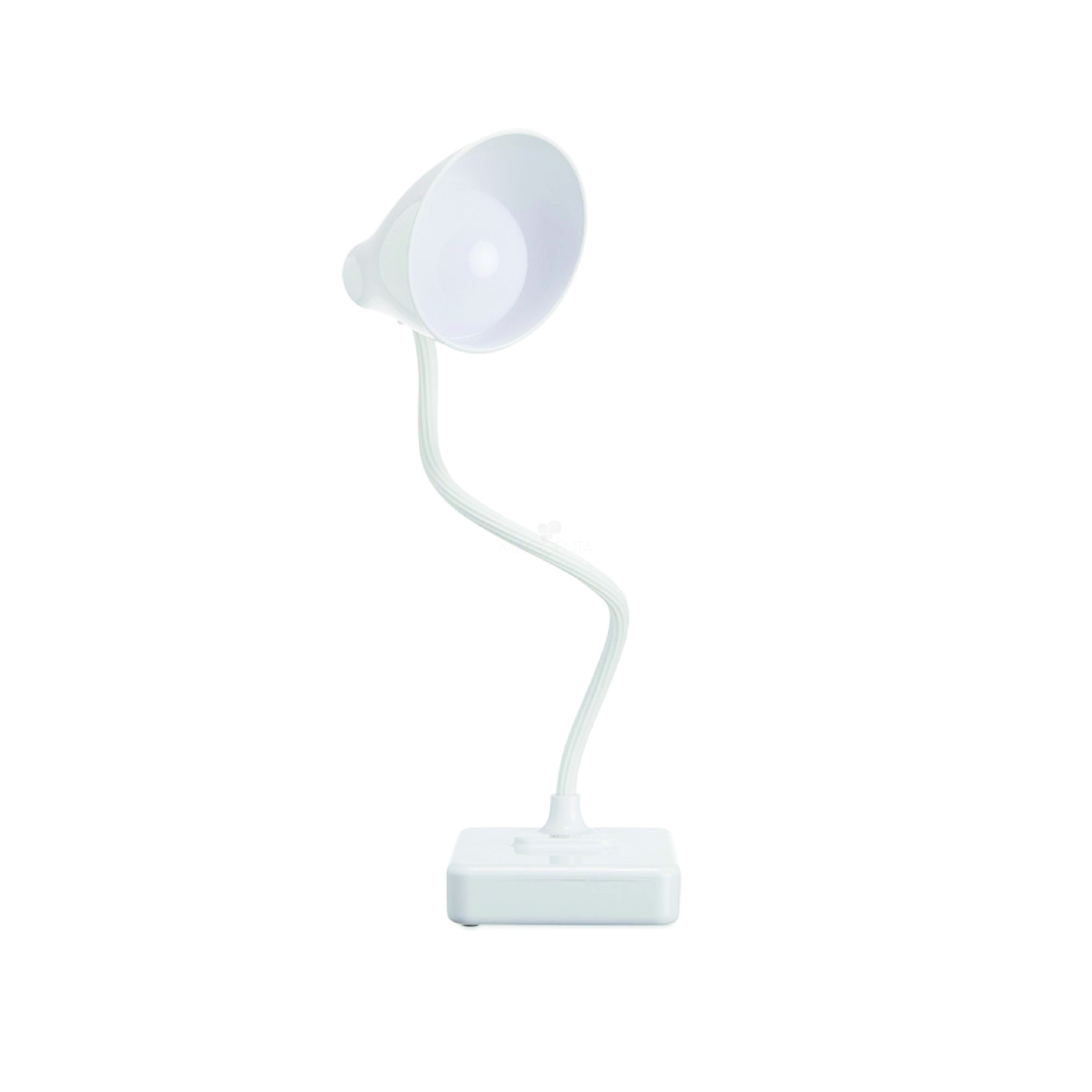 Luminária plástica touch articulável com suporte para celular. Contém três tipos de iluminação: luz branca (fria), luz de descanso (amarela), e luz forte (junção da luz branca com a amarela). O produto possui bateria interna e acompanha cabo USB.