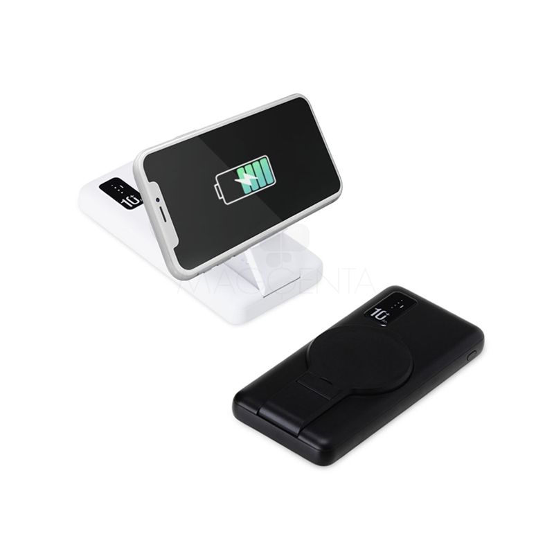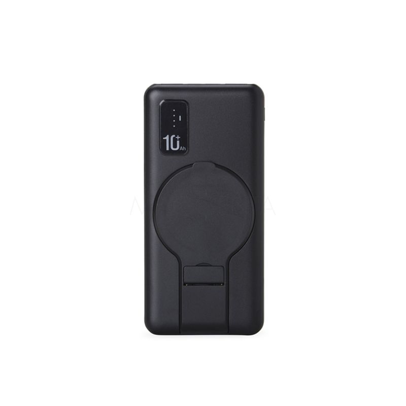 Carregador portátil plástico via indução ou via cabo com 10.000mAh e indicador led de bateria. Com suporte inclinável para o carregamento via indução, o power bank possui duas portas de saídas USB, possibilitando o carregamento de dois dispositivos simultaneamente. Contém porta de entrada tipo-C, V8 e acompanha cabo USB.