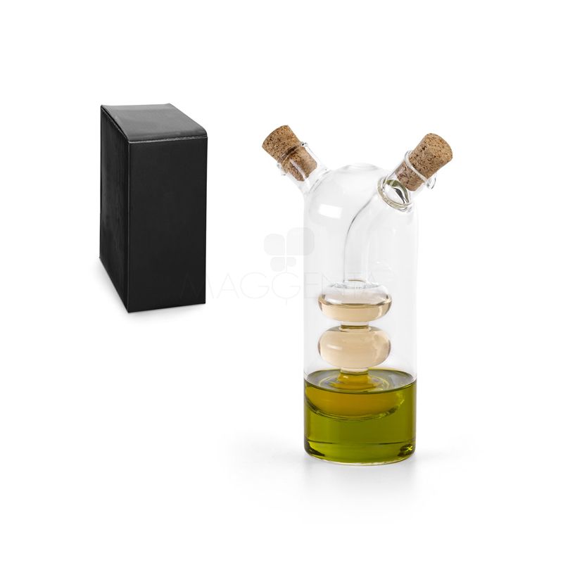 Galheteiro em vidro que contém dois reservatórios com capacidades de até 50 ml e de até 250 ml. O galheteiro contém duas rolhas de cortiça. Fornecido em caixa presente.