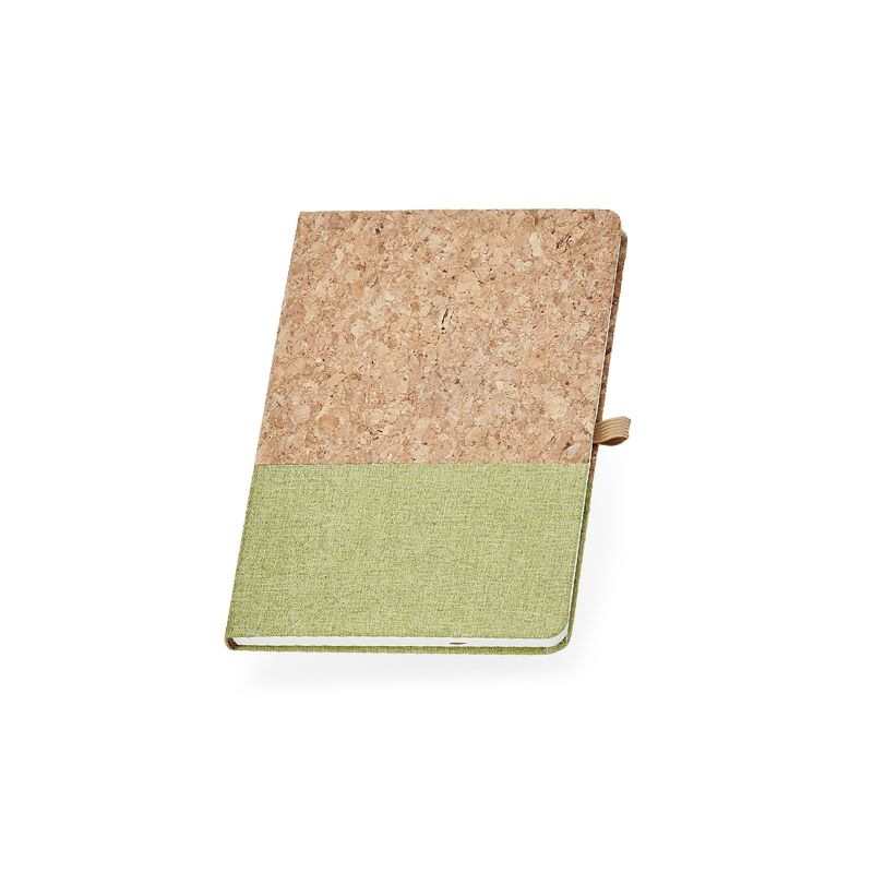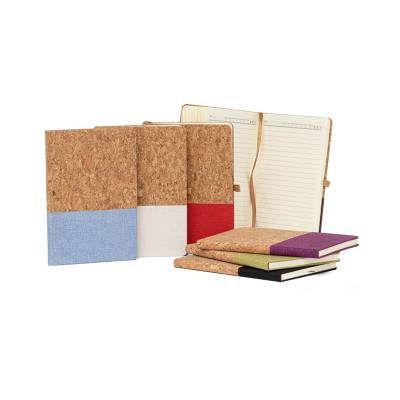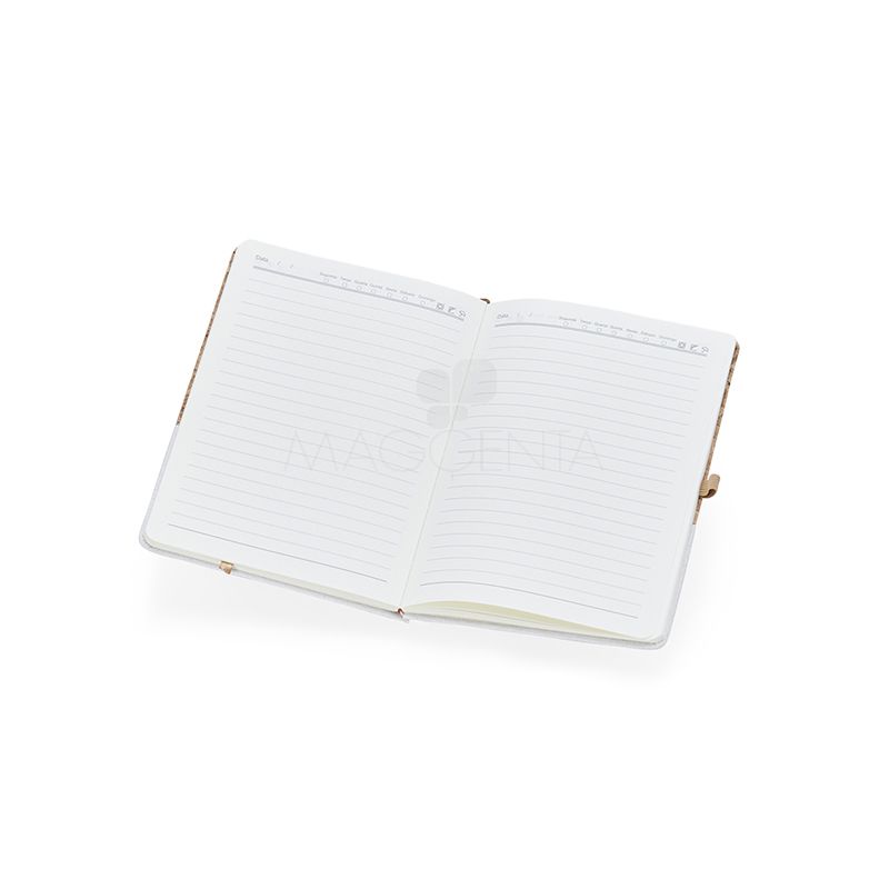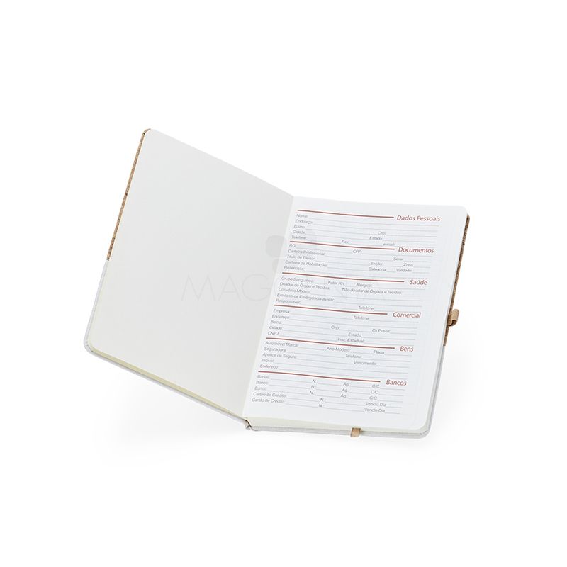 Bloco de anotações personalizado produzido cortiça com detalhe em linho, possui capa dura, marcador de página com fita de cetim, suporte para caneta, folhas pautadas, possui campo para data; dia da semana e condição climática, página para dados pessoais, calendário 2023 a 2025 e por fim, folhas para planejamento anual.
