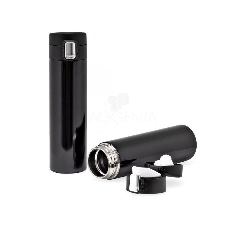 Squeeze garrafa personalizada produzido em metal inox 304, com capacidade de até 400 ml e tampa plástica atóxica rosqueável e anel de vedação em silicone para evitar vazamento, sistema de abertura automática com acionamento por botão frontal e trava de segurança para evitar que abra acidentalmente.