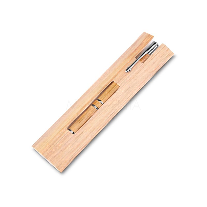 Caneta de bambu personalizada com click e ponteira de fibra de trigo / ABS. Possui esferográfica azul e acionamento da escrita por click. Acompanha estojo de papel impresso com imitação em bambu. Ideal para divulgar sua empresa em eventos corporativos, brindes personalizados e campanhas promocionais.