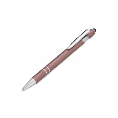 Caneta de metal personalizada com dois aneis cromados adicionando mais beleza e elegância ao produto. Possui acionamento por click com escrita na cor azul, ponteira touch para uso em tablets e smartphone.