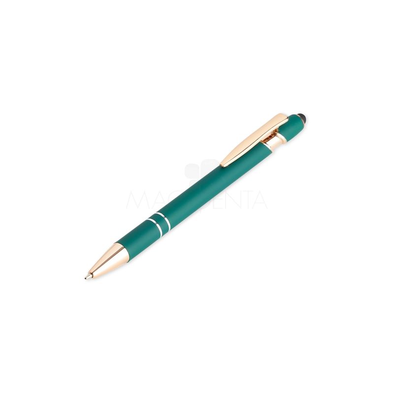 Caneta de metal personalizada. Clip de metal e a extremidade acobreados dando mais elegância, ponteira touch para uso em tablets, smartphones e telas touch screen, possui acionamento por click com escrita esferográfica na cor azul e acabamento soft touch de diversas cores. Ideal para brindes promocionais e eventos corporativos.