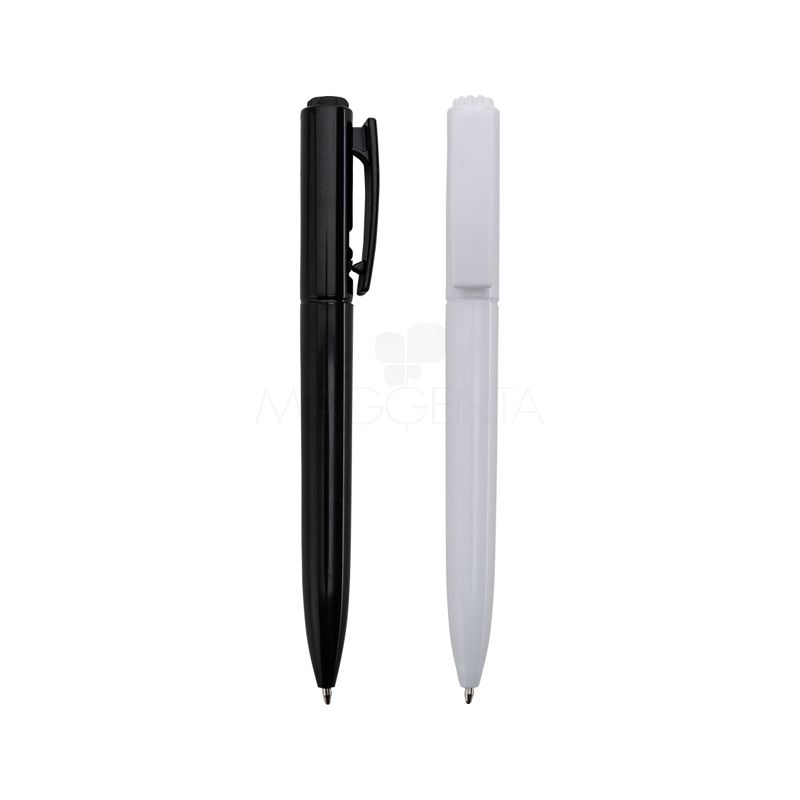 Caneta plástica personalizada com detalhe em relevo na parte superior ao redor do clip. Possui escrita na cor azul, acionamento por clique e para destravar basta apertar a parte inferior do clip. Ideal para divulgar sua empresa em eventos corporativos, brindes personalizados e campanhas promocionais.