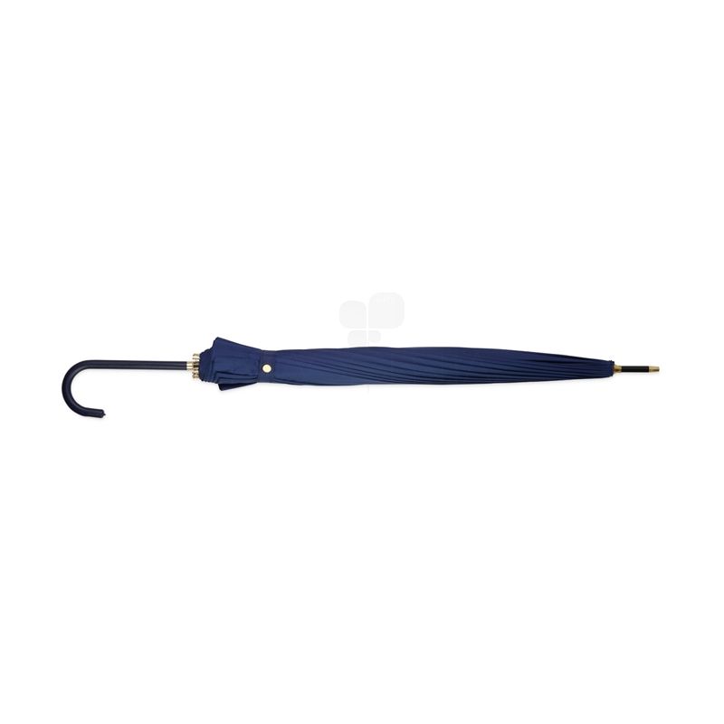 Guarda-chuva de poliéster de impacto impermeável com abertura automática, estrutura em aço e 16 varetas em fibra de vidro. Possui pegador em couro sintético com botão de acionamento.