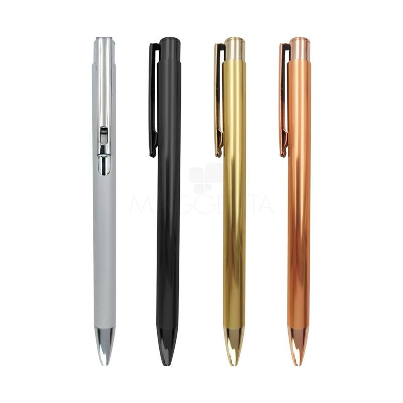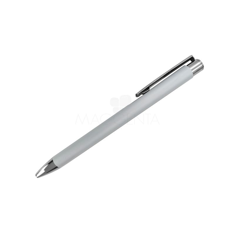 Caneta em metal com acabamento brilhante, porém na cor prata acabamento fosco, possui acionamento por clique e esferográfica na cor azul com uma escrita macia e confortável. Ideal para divulgar sua empresa em eventos corporativos, brindes personalizados e campanhas promocionais.
