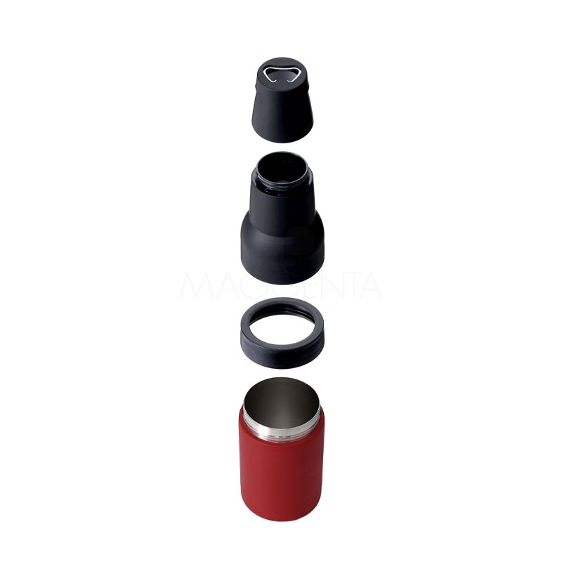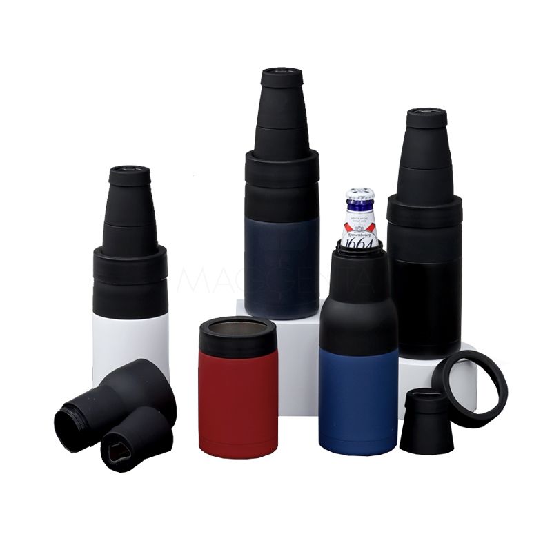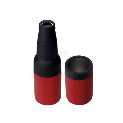 Copo térmico multiuso em inox e plástico personalizado, pode ser usado como porta long neck ou porta lata e possui abridor de garrafa. Ideal para brindes promocionais e eventos corporativos.