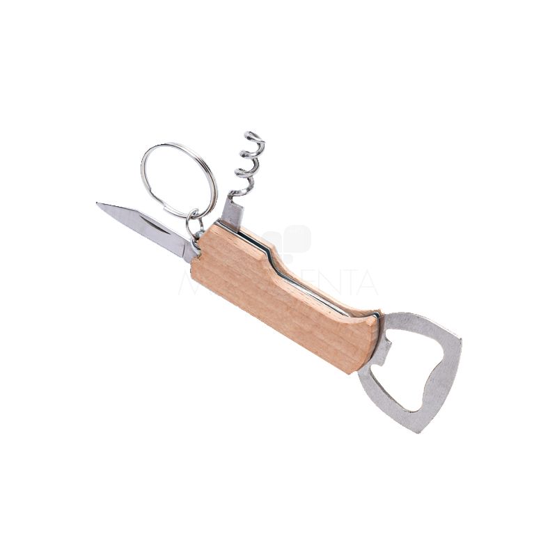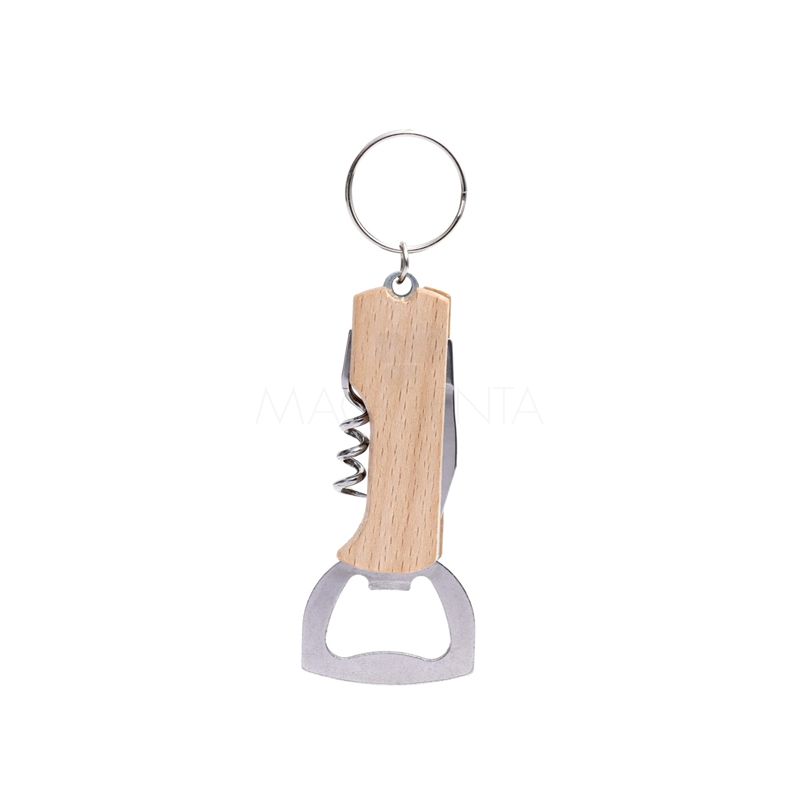 Chaveiro multifunções em madeira com abridor de garrafas, saca rolhas e lâmina de corte. Ideal para divulgar sua empresa em eventos corporativos, brindes personalizados e campanhas promocionais.