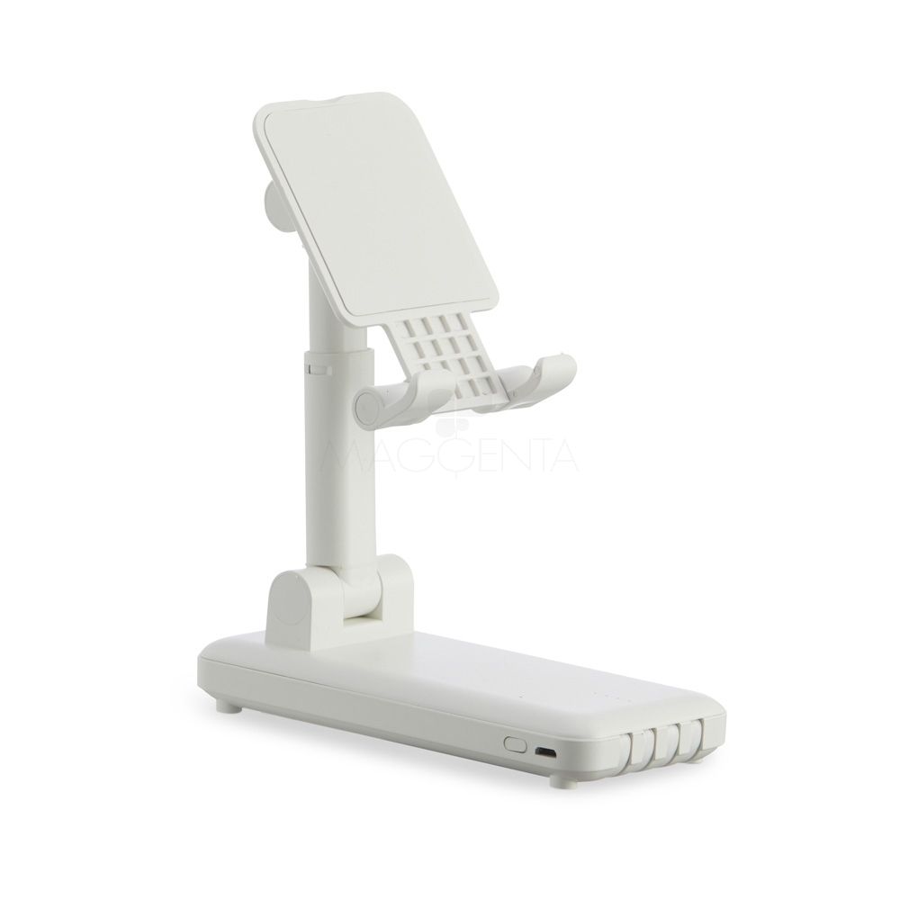 Power bank 10.000mAh multisaídas com suporte personalizado, portátil com uma base de carregamento em que permite simultaneamente ser usada como um carregador e um porta celular com regulagem de altura e ângulo e tendo ainda a base antiderrapante. É um objeto de design arrojado e dadas as suas características técnicas pode ser usado em viagens (como bateria portátil). Bateria com indicador de carga LED, possibilita o carregamento de até 2 dispositivos em simultâneo, com entrada micro USB e saídas tipo-C, lightning, V8 e micro USB. Capacidade de 10.000 mAh. Fornecida em caixa presente com cabo incluso. Tendo a parte externa confeccionada em plástico resistente, podendo personalizar com o seu logo e trazer destaque a sua empresa. O carregador ideal para brindes corporativos e eventos promocionais.