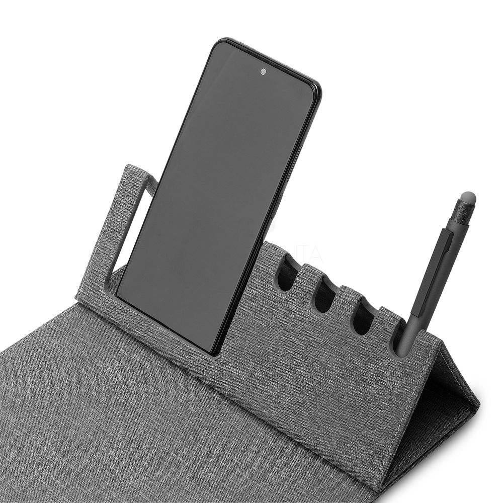 Mouse pad em material reciclável, contendo: Porta canetas; Porta cartões ou apoio para celular;