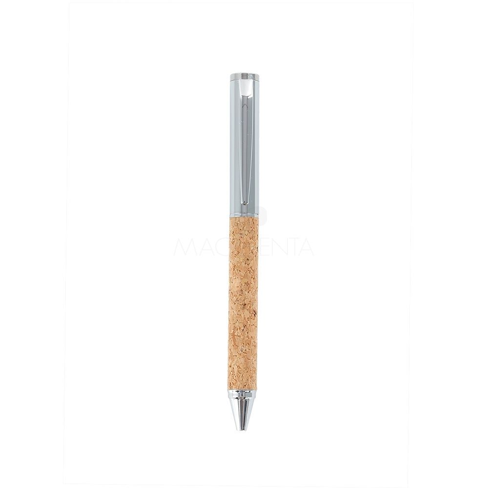 Caneta metálica com detalhe em cortiça, carga esferográfica azul 1.0mm e acionamento por rotação.