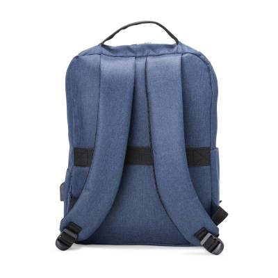 Mochila de nylon 26 Litros com detalhes em couro sintético e quatro compartimentos, sendo o principal com bolso para notebook 15,6. Com divisórias internas para acessórios, a mochila possui bolso lateral, suporte externo USB e alça para engate em malas de viagem.
