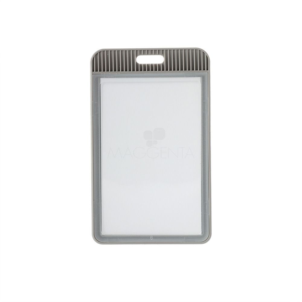 Porta crachá ou porta credencial em plástico resistente. Suporte com visor transparente removível e abertura superior para prender o cordão.