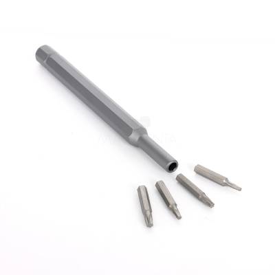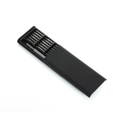 Kit ferramenta com 25 peças em estojo plástico com tampa de encaixe. Contém: 1 chave extensora rotatória para conexão das ponteiras, 1 ponteira Tri-Wing, 5 ponteiras Phillips, 4 ponteiras fenda, 10 ponteiras Torx, 2 ponteira Allen, 1 ponteira spanner e 1 ponteira fenda triangular.