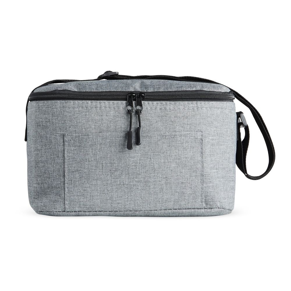 Bolsa térmica 6 litros de poliéster. Contém bolso frontal com zíper e alça transversal regulável em nylon (não removível).