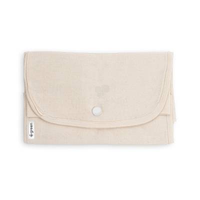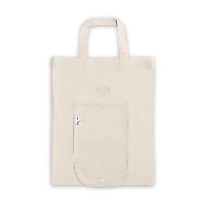 Sacola dobrável em algodão (140 g/m²) composta por 50% algodão e 50% algodão reciclado, com alças de 38 cm.